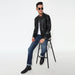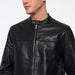 • Band Collar: Stand-up collar with snap-button closure for a sleek biker look.