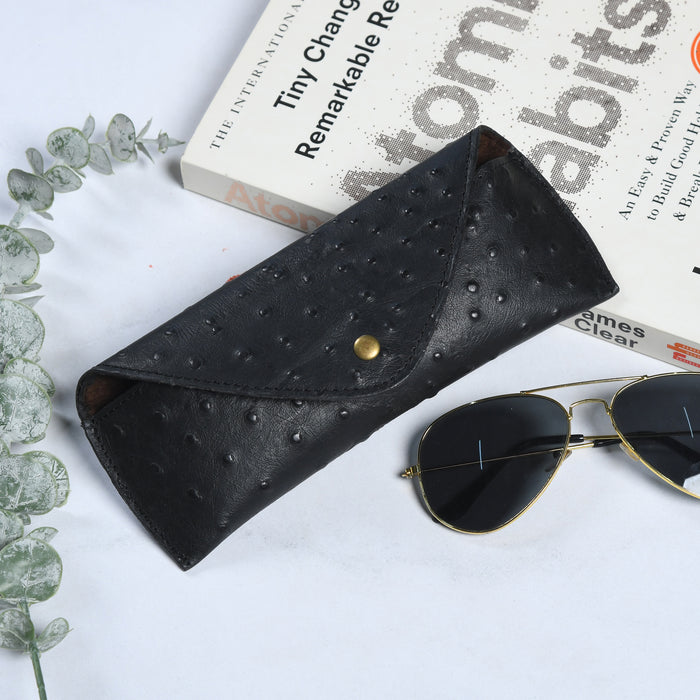 Make a bold statement with this black genuine leather eyeglass case, featuring a premium pebble-texture finish and a sleek brass button closure. Handcrafted for durability and elegance, it’s designed to protect your sunglasses or prescription glasses in style. The structured body and soft interior lining keep your eyewear safe from scratches and impact. Compact, lightweight, and perfect for everyday use or travel.